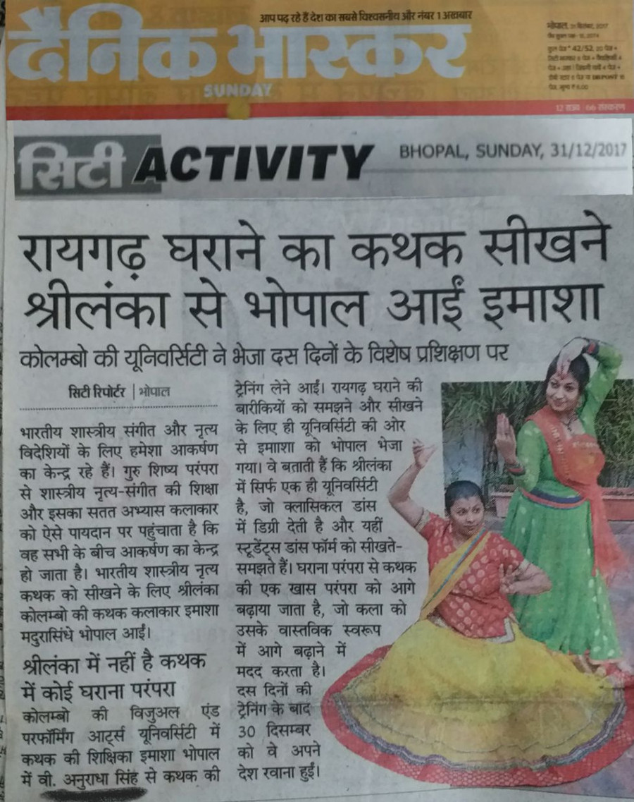 Vrinda kathak kendra is established since 2005, there are 200 students annually learning pure classical kathak dance in the center. V. Anuradha Singh herself trains all the students who belongs to India and Abroad regularly come to Bhopal to take her guidance. Recently Mrs.Imasha Mradula Singhe who is senior lecturer of kathak dance in Visual and Performing Arts University Colombo, Srilanka came to Bhopal to take training by V. Anuradha Singh in Dec,2017.